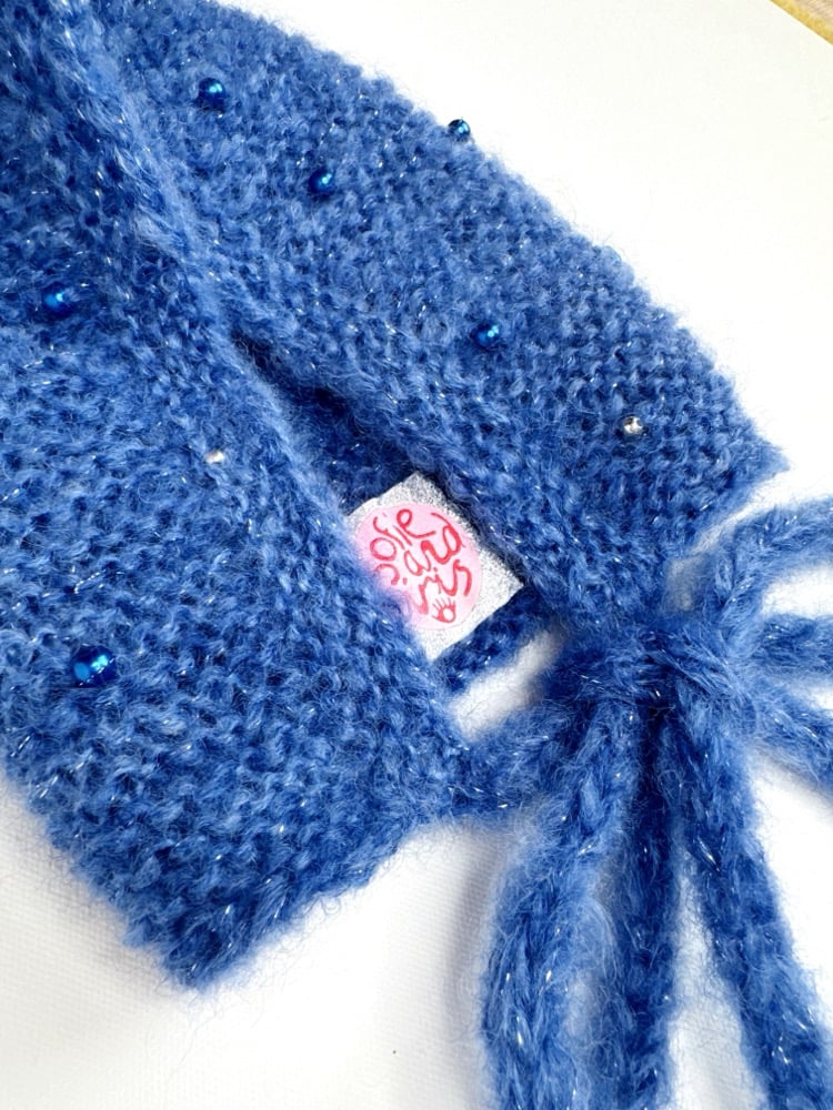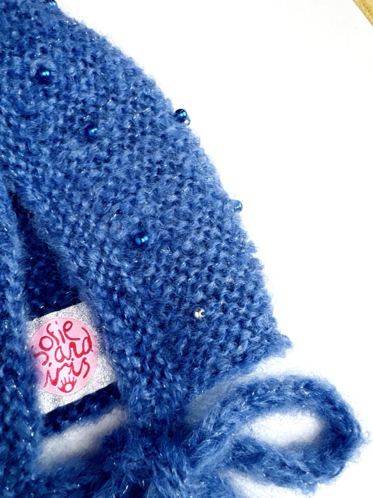 Mohair Bonnet Dark Blue and subtle glitter – Luxury Hand-Dyed Mohair Blend, Hand-Knitted With Beads & Vintage Buttons