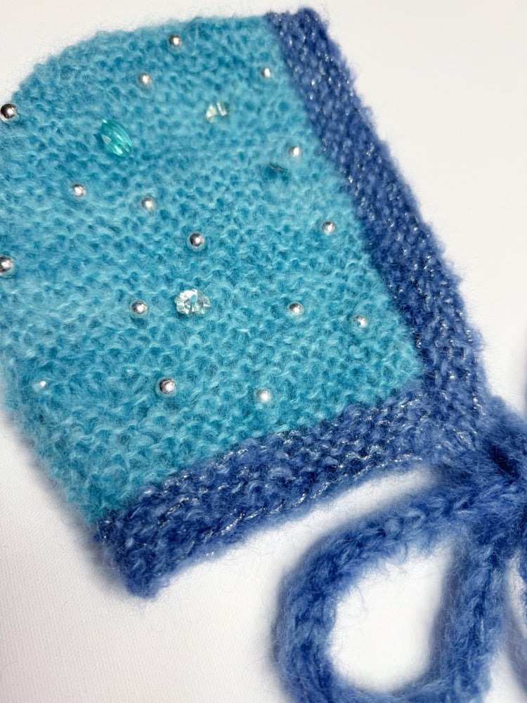 Inspired by dark winter skies filled with shining stars, this hand-knitted bonnet is crafted from a luxury hand-dyed mohair blend in rich dark turquoise and deep blue shades. Soft, lightweight, and naturally warm, it’s designed for a snug, cozy fit that ties into a sweet bow under the chin—a blend of comfort, charm, and artistry.