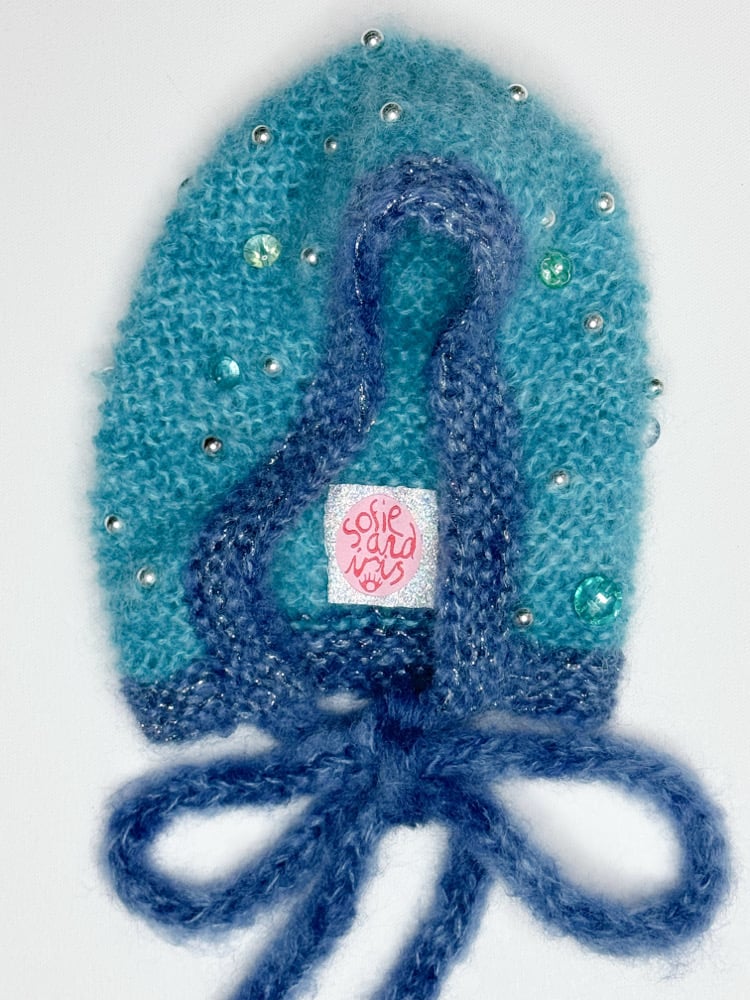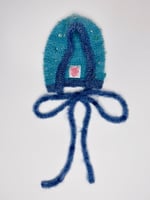 Inspired by dark winter skies filled with shining stars, this hand-knitted bonnet is crafted from a luxury hand-dyed mohair blend in rich dark turquoise and deep blue shades. Soft, lightweight, and naturally warm, it’s designed for a snug, cozy fit that can be wrapped around the neck and ties into a sweet bow under the chin—a blend of comfort, charm, and artistry.